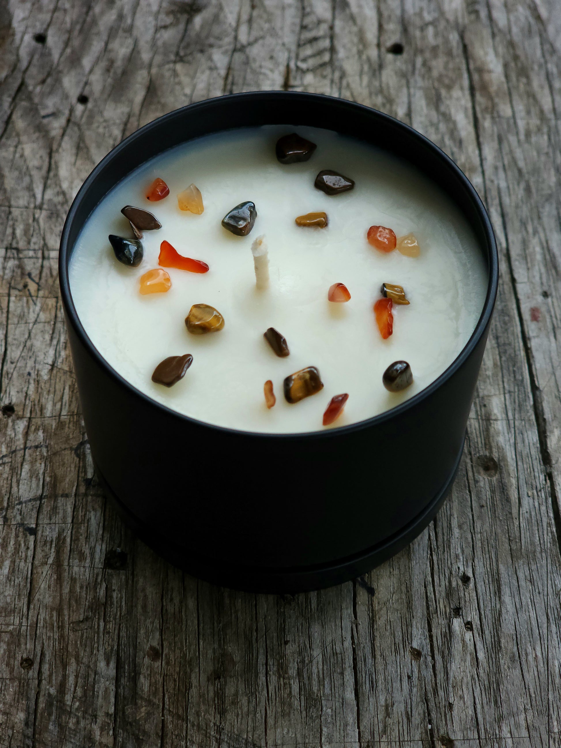 Enjoy the aroma of this 100% natural soy wax candle scented with Gingerbread Spice and decorated with Tiger's Eye and Carnelian gems set in an 8 ounce black tin.